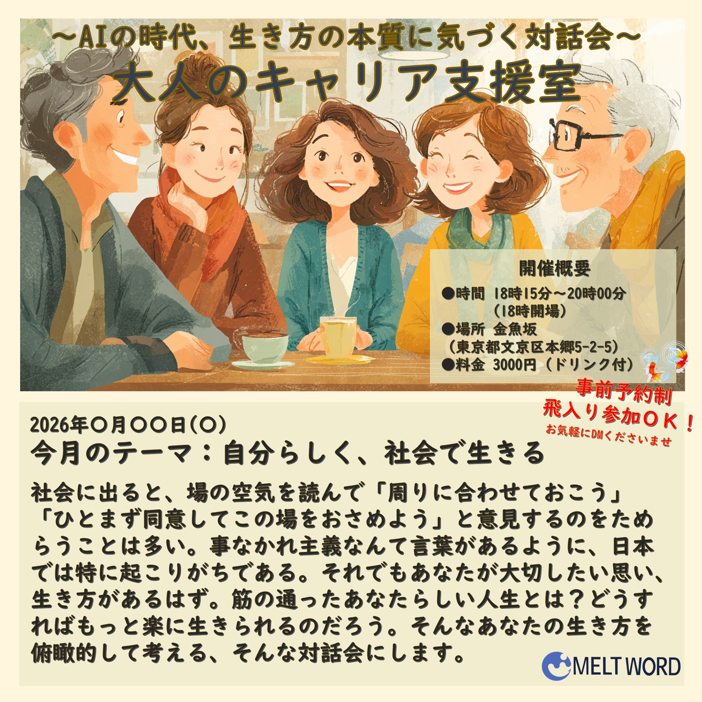 大人のキャリア支援室は、アットホームな雰囲気で、自分の生き方や働き方について話せる勉強会です。「明日も頑張ってみようかな」とちょっと前向きになれるように、ぜひ気軽にお立ち寄りください。